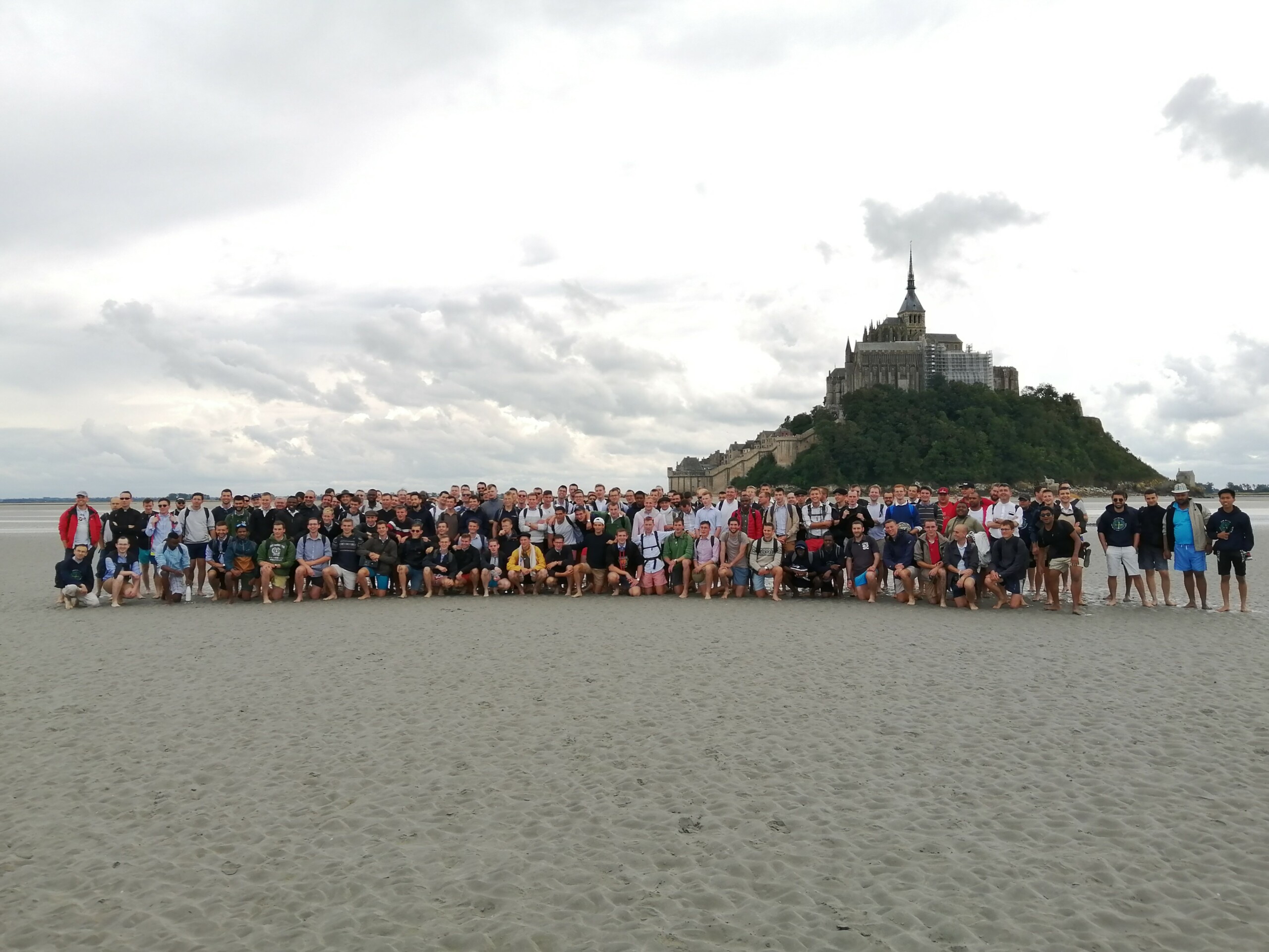 Malgré des prévisions météo plus que pessimistes, nous nous élançons pour une bonne heure et demie de marche dans ce désert humide. La traversée est animée par la communauté Saint Martin, qui nous propose de la vivre en portant au cœur une intention à confier à l’Archange. Dans ce grande vide si plat, le premier quart d’heure en silence pousse à la contemplation. Celle-ci est rendue toutefois difficile à cause de la vase dans laquelle les pieds s’enfoncent, parfois jusqu’aux mollets ! Pour autant, si la marche n’est pas très rapide, le cœur y est, d’autant que le ciel reste clément, couvert mais sec… Les chants commencent à monter de notre petite troupe, alors que la silhouette du Mont se fait sans cesse plus proche. C’est donc une compagnie pleine d’énergie qui finalement arrive au Rocher, sous les regards amusés et intrigués des passants devant tous ces garçons chantant les merveilles du Seigneur.